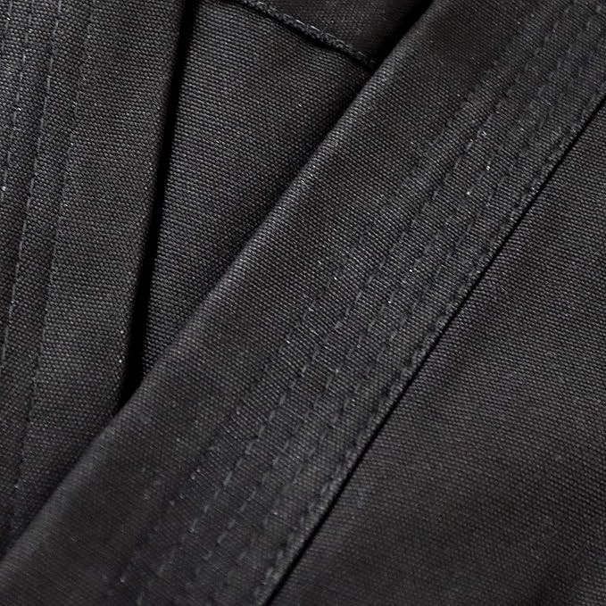 Nehéz fekete karate ruha (karategi), tökéletes katához, önvédelemhez vagy szabadtéri edzéshez; sima, puha vászonból (100% pamut) készült, a legjobb 340 grammos minőségben; hagyományos szabású kabát, mindkét oldalán fűzőkkel; rugalmas nadrág extra fűzőkkel; a rugózással ellátott ülep biztosítja az optimális mozgást; többszörös varrás az összes szegélyen, megerősített hónalj, hajtóka és oldalak.