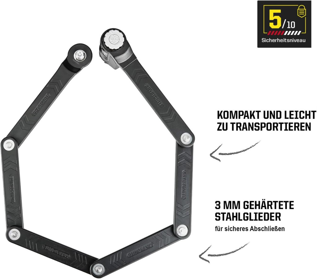 - A 85 cm hosszú Kryptonite Keeper 585 egy összecsukható kerékpárzár, amely rugalmas biztonságot nyújt országúti kerékpárokhoz, hegyi kerékpárokhoz, elektromos kerékpárokhoz, rollerekhez és egyebekhez; súlya 0,77 kg.