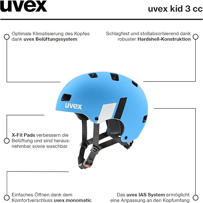 Az Uvex Kid 3 CC egy strapabíró és biztonságos gyerek kerékpáros sisak, amelyet kifejezetten a fiatal bringások igényeihez terveztek. Könnyű, ugyanakkor masszív szerkezete megbízható védelmet nyújt, míg az egyedileg állítható illeszkedőrendszer kényelmes és stabil viseletet biztosít. A matt kék-fehér dizájn modern, sportos megjelenést ad, a kiváló szellőzés pedig gondoskodik a kellemes hőérzetről.